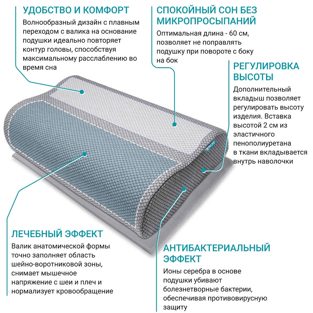 Подушка: вязкоэластичный пенополиуретан с ионами серебра.